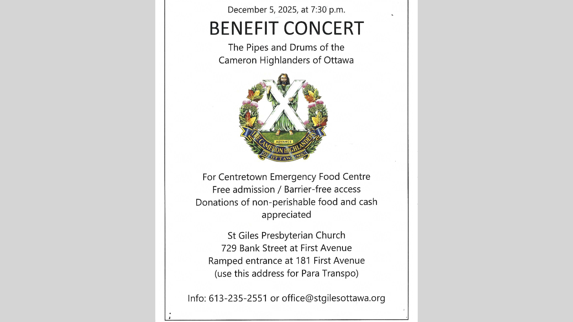 Special Events December 5, 2025, Christmas Concert by the Pipes and Drums of the Cameron Highlanders December 6, 2024, Christmas Concert by the Pipes and Drums of the Cameron Highlanders October 4, 2024, Memorial Service of Roger White December 1, 2023, Christmas Concert by the Pipes and Drums of the Cameron Highlanders June 10, 2023, Memorial Service of Pauline Brown May 6, 2023, Funeral Service of Robert Fourney April 6, 2022, Taize Prayer Service